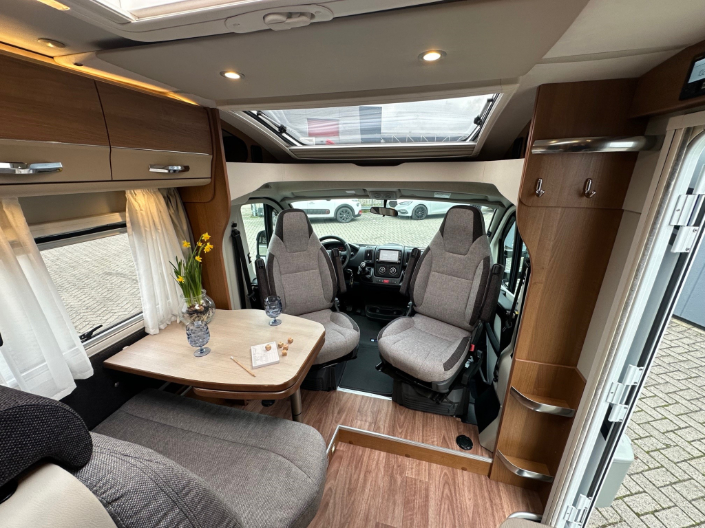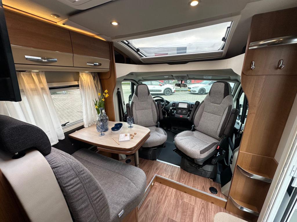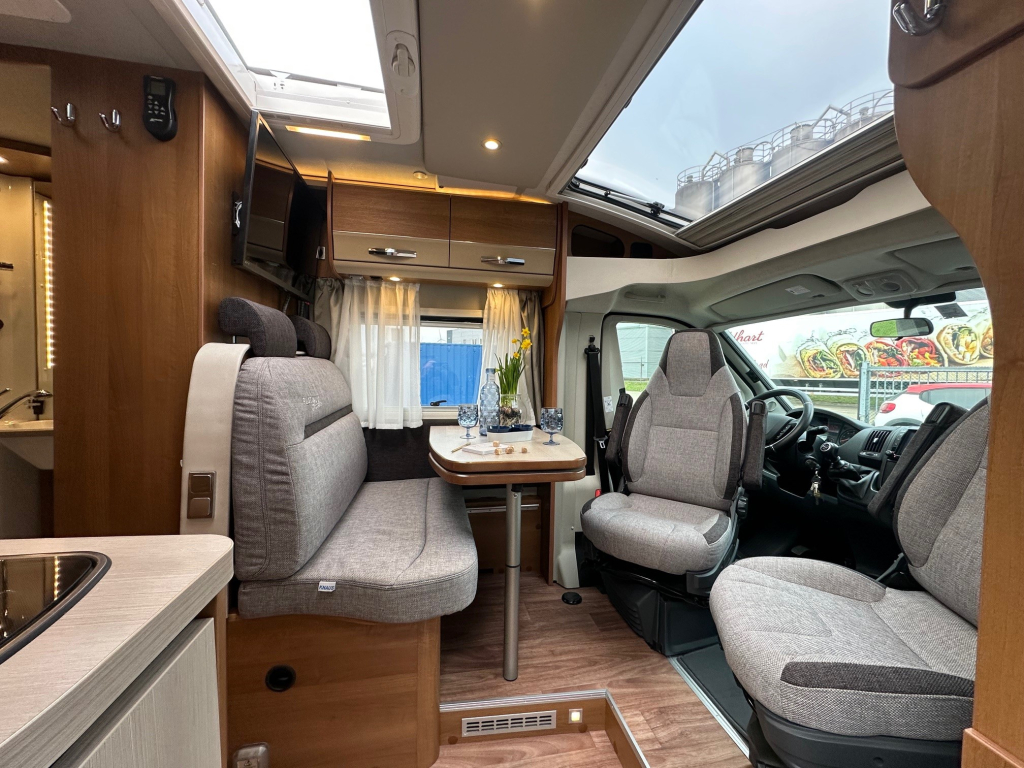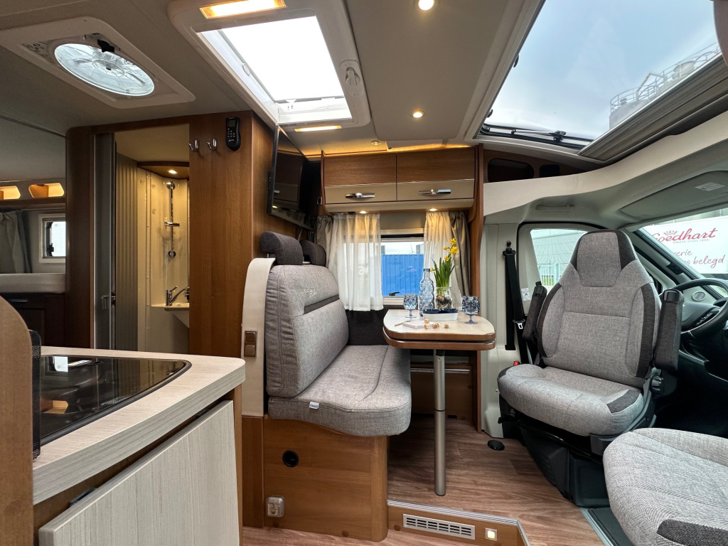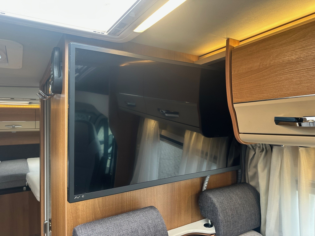 Ook op het gebied van comfort en zelfstandigheid is deze camper volledig uitgerust. De Duo Control installatie zorgt voor veilig en efficiënt gasgebruik, terwijl de MaxxFan dakventilator een aangenaam binnenklimaat creëert, zelfs op warme dagen. Het zonnepaneel maakt het mogelijk om langer vrij te staan zonder afhankelijk te zijn van campingaansluitingen. Voor ontspanning onderweg beschikt deze camper over een schotelinstallatie en maar liefst twee flatscreen televisies, zodat u overal kunt genieten van uw favoriete programmas.