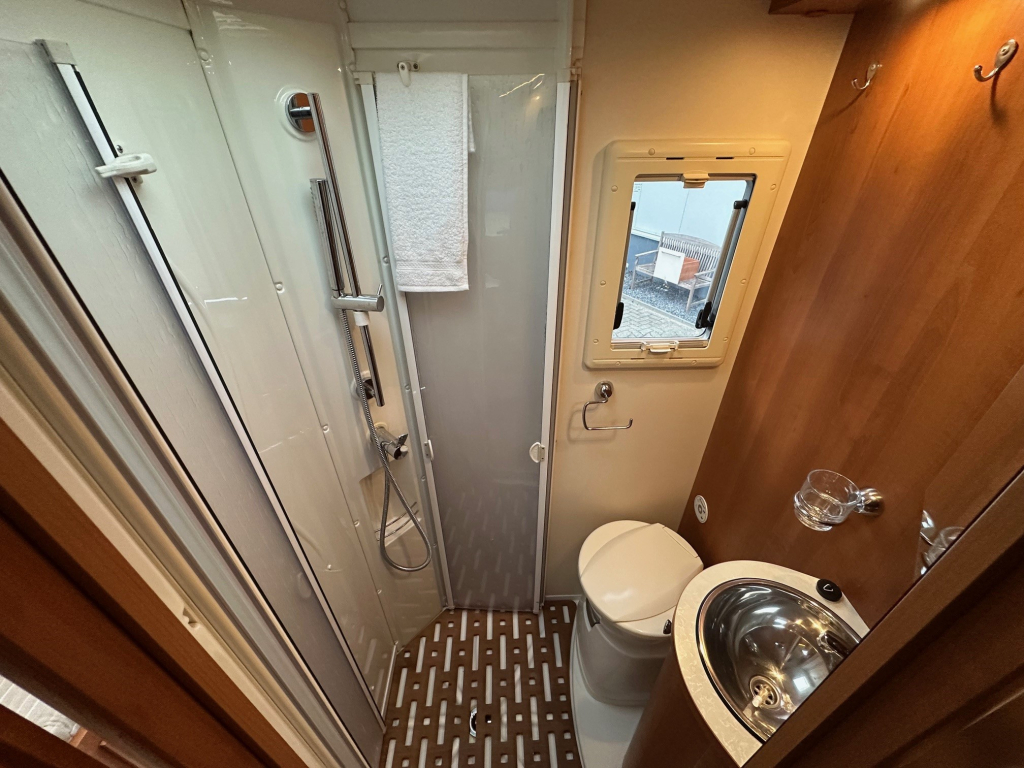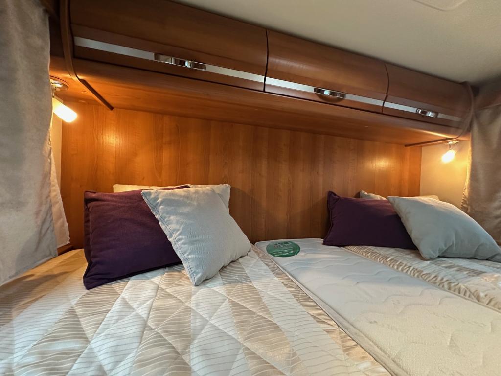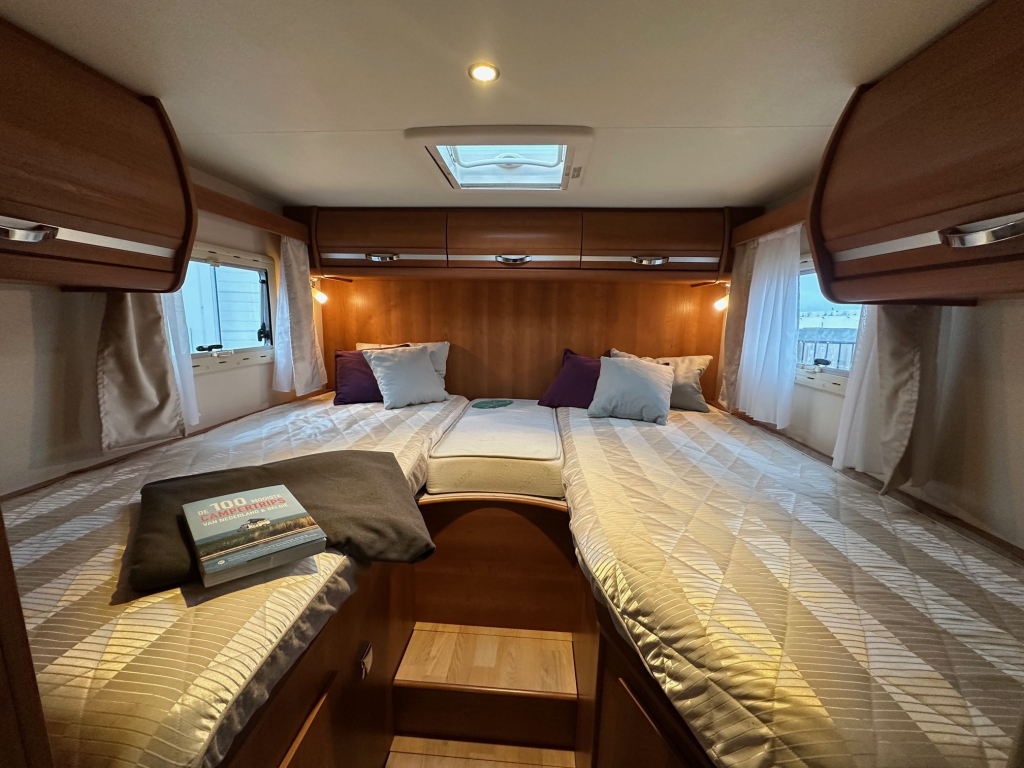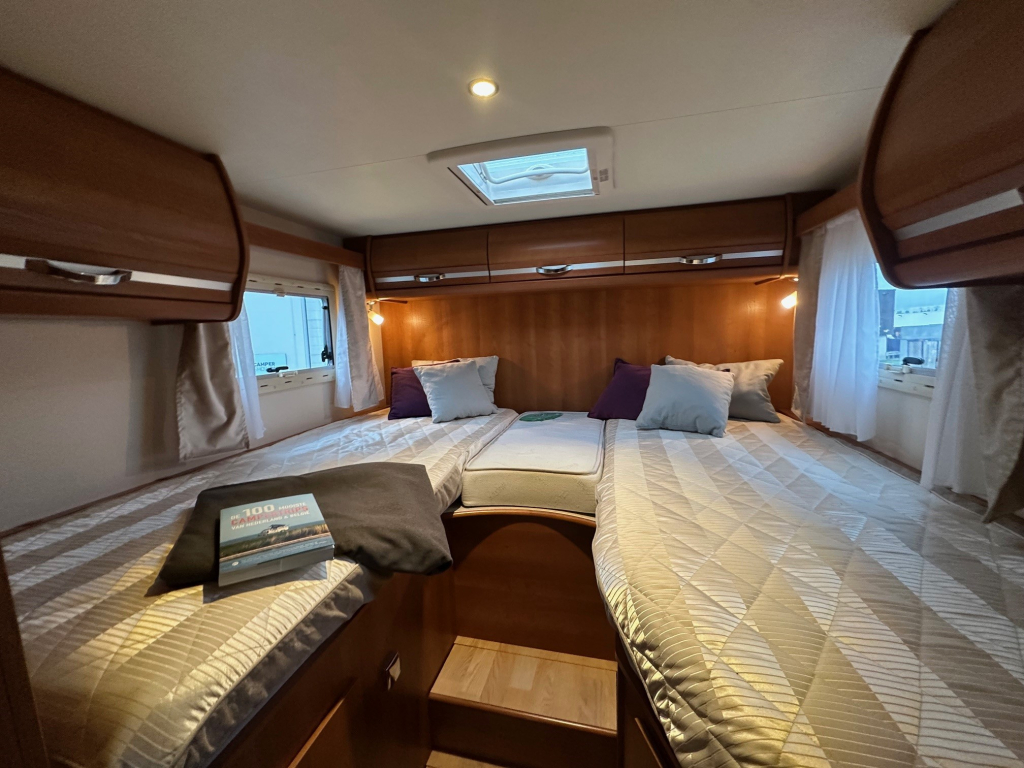 Achterin bevinden zich comfortabele enkele bedden die eenvoudig toegang bieden en zorgen voor een prettige nachtrust. Daarnaast is de camper voorzien van een hefbed, waardoor er extra slaapplaatsen beschikbaar zijn zonder dat dit ten koste gaat van de leefruimte overdag. De ruime badkamer en de grote garage maken het comfortniveau compleet. In de garage is meer dan voldoende plaats voor fietsen, kampeeruitrusting en andere bagage.